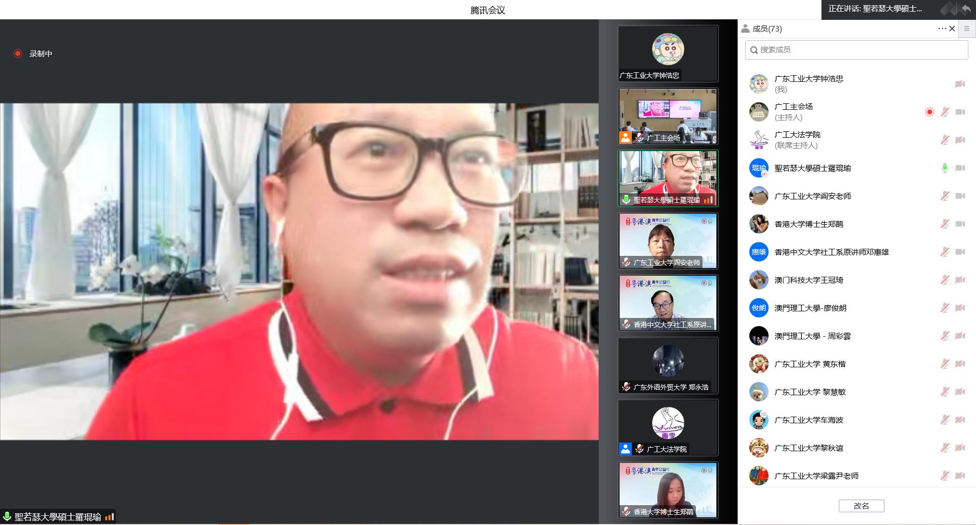 在三地社会工作发展情况交流环节,香港中文大学社会工作学系原讲师邓惠雄从香港社会福利服务概况、香港社会工作者业界组织概况、新冠疫情下社会工作面临的挑战与机遇等三方面介绍了香港社会工作发展情况;澳门理工大学社会工作学系讲师梁启贤以《澳门社会工作:官民合作的典范》为题,阐述了澳门社会服务、澳门社会工作局和澳门非政府组织的运行情况;半岛体育(中国)官方网站法学院社会工作系副教授朱媛媛则介绍了该校社会工作专业课程设置及实习安排。
