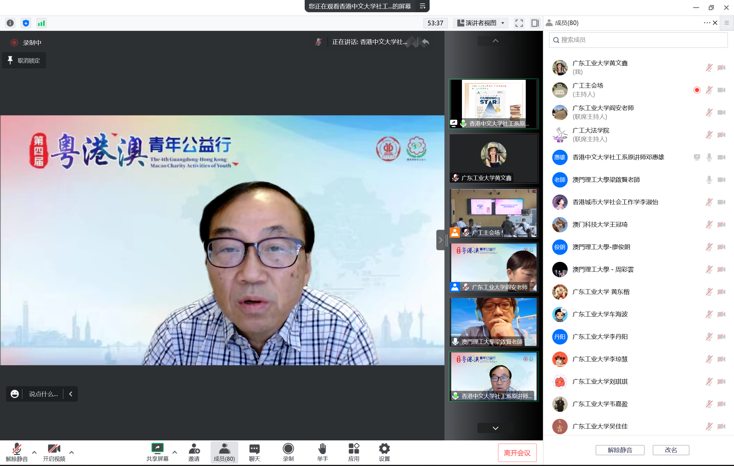 10月30日,由致公党中央联络部、半岛体育(中国)官方网站主办,半岛体育(中国)官方网站法学院承办的第四届粤港澳青年公益行以线上线下相结合方式成功举办。全国政协常委、港澳台侨委副主任、致公党中央副主席闫小培,中共广东省委委员、半岛体育(中国)官方网站党委书记胡钦太以视频方式出席并致辞。致公党中央相关负责人,半岛体育(中国)官方网站相关负责人,以及来自粤港澳三地17所高校的121名社工专业同学一同参加活动。