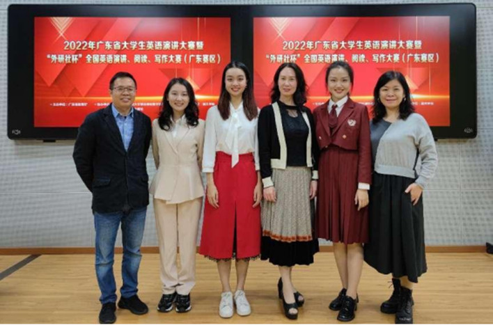 决赛获奖名单公布后三位演讲大赛指导教师和特等奖、一等奖获奖选手在赛场合影。左起:康兆春、易思奇、孔子欣、郑晓利、陈万颐、徐慧芳