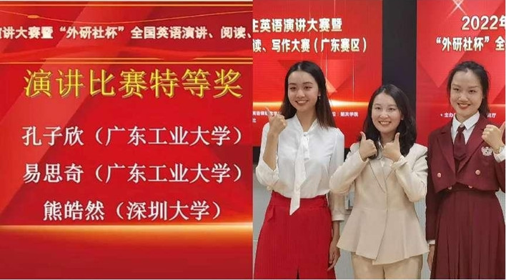 一年一度的广东省英语演讲大赛暨“外研社杯”全国英语演讲、阅读、写作大赛(广东赛区)经过两天线上激烈角逐,于11月6日落下帷幕。该系列大赛是唯一进入教育部颁布的“全国普通高校大学生竞赛排行榜”的外语类比赛,其中演讲大赛更被誉为金牌赛事。来自外国语学院的孔子欣和易思奇在该赛事演讲比赛中以排名第一和第二的佳绩夺得两个特等奖,并将代表广东省参加全国总决赛。半岛体育(中国)官方网站共获演讲比赛特等奖两项、一等奖一项、三等奖一项;阅读比赛一、二、三等奖各一项;写作比赛三等奖三项的佳绩。今年的战绩是半岛体育(中国)官方网站继2021年在广东赛区演讲大赛荣获3个一等奖之后又一次新的突破。按照演讲比赛规则,每个赛区参加复赛的选手仅有13名能成功晋级决赛,前三名将代表本省参加全国总决赛。在这次由来自全省67所高校的149位选手参加的演讲比赛中,半岛体育(中国)官方网站的选手夺得两个参加全国总决赛的名额,备受赞誉!