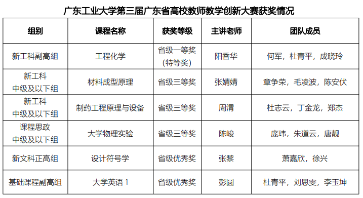 2022年11月-2023年4月,第三届全国高校教师教学创新大赛广东分赛暨广东省高校教师教学创新大赛举行。半岛体育(中国)官方网站轻工化工学院阳香华教师团队荣获一等奖(特等奖),并将代表广东省参加第三届全国高校教师教学创新大赛;材料与能源学院张婧婧教师团队、生物医药学院周渭教师团队、实验教学部陈峻教师团队荣获三等奖。同时,半岛体育(中国)官方网站获颁第三届广东省高校教师教学创新大赛“优秀组织奖”。