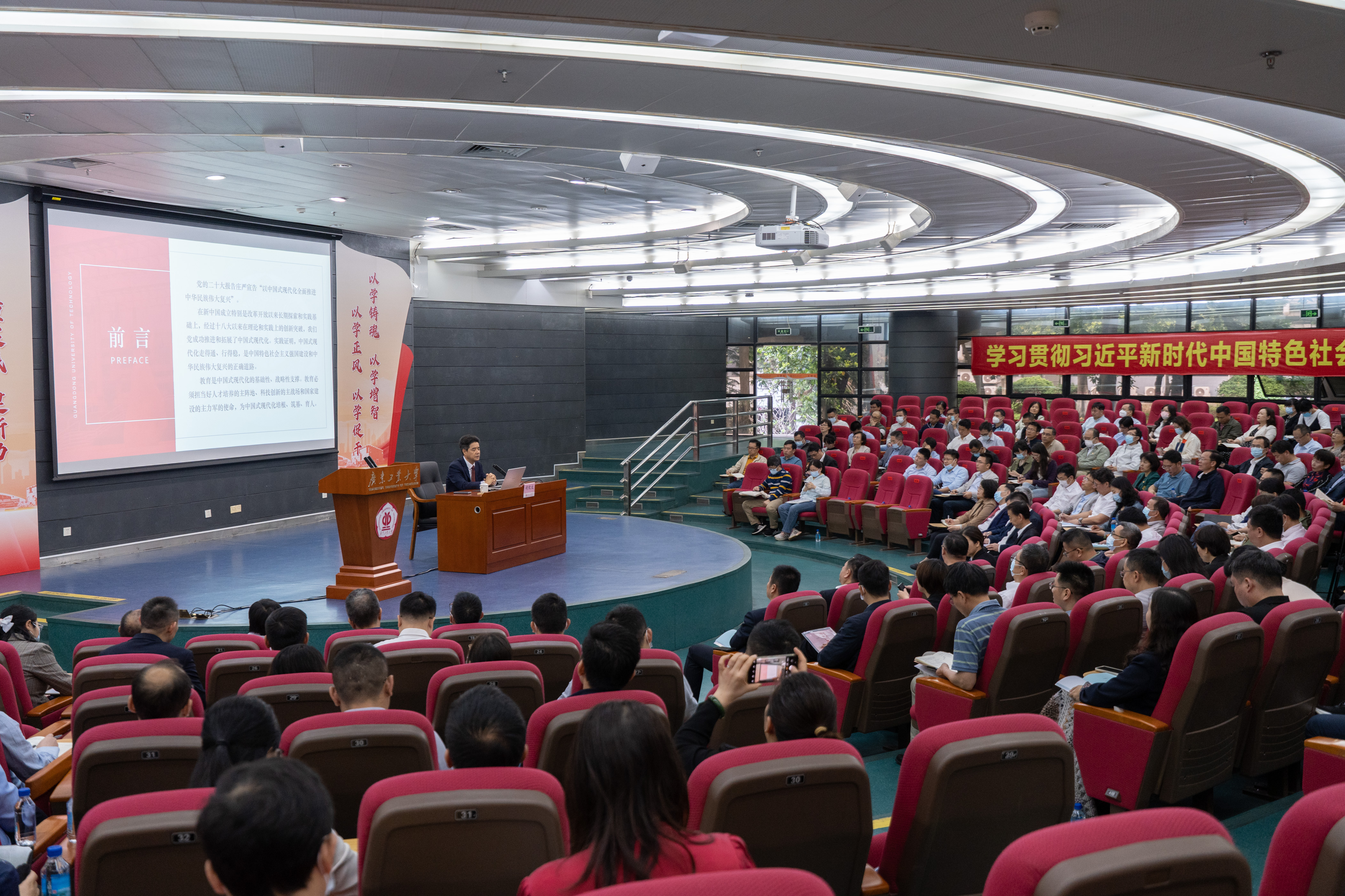 24日下午,周峰以“学习贯彻习近平新时代中国特色社会主义思想 奋力谱写中国式现代化的广东篇章”为题,从全面把握以“十个明确”为核心的逻辑体系、运用好“六个必须坚持”的世界观方法论、积极探索和推进中国式现代化的广东路径等三个方面作出系统阐述和分析,作了一场思想深刻、内容丰富的辅导报告。
