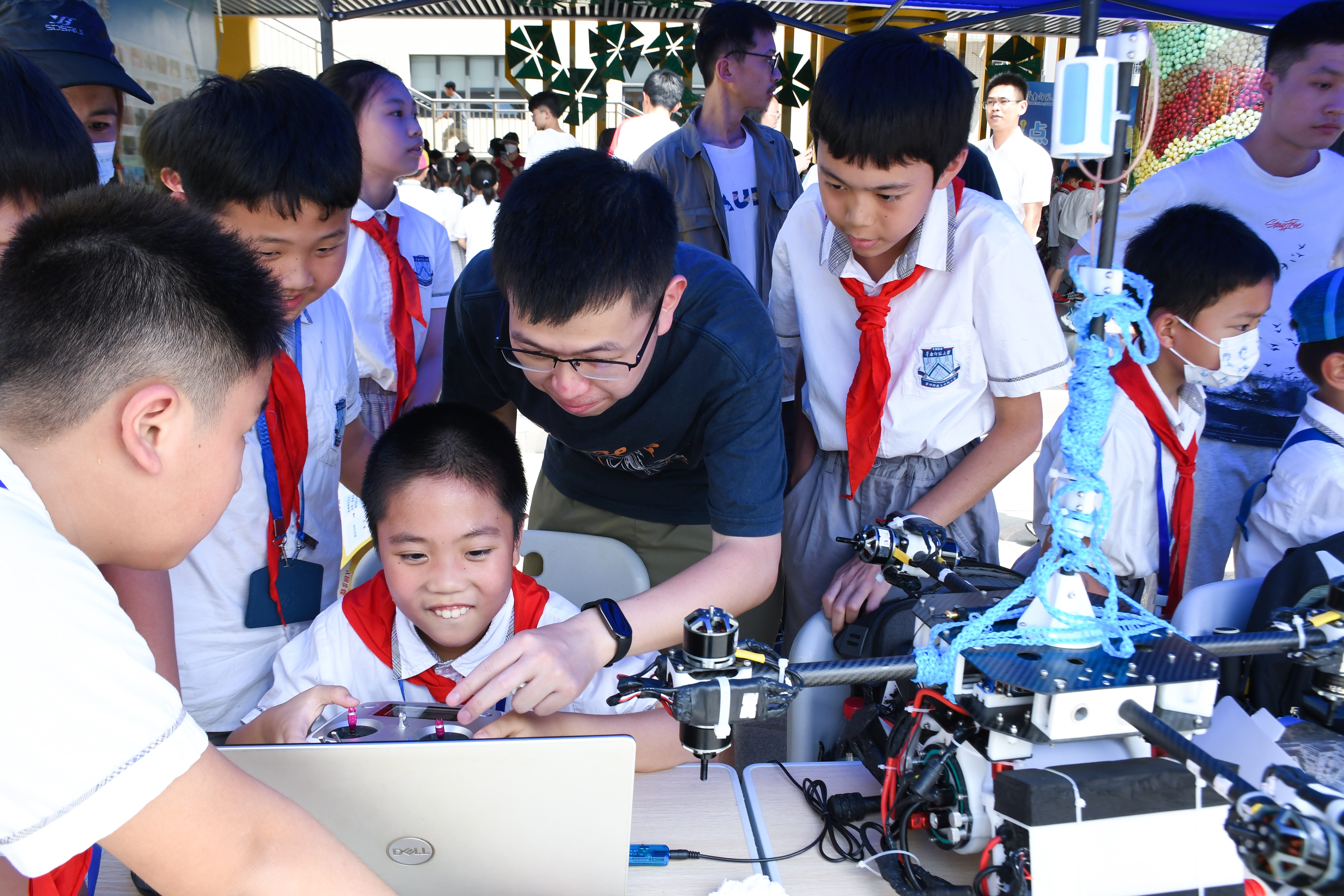 5月29日上午,华师附属大学城小学2023年科技节暨六一国际儿童节庆祝活动隆重举行,学校国家级创新创业教育实践基地——工大创谷创享社的7支学生创新创业团队40余名本科生和研究生受邀到活动现场为1500余名师生及家长呈上了一场趣味十足的科创盛宴,让小朋友们近距离感受科技创新的魅力,激发探索未来的热情。学校党委书记胡钦太出席活动,鼓励团队大学生心怀国之大者,不仅要勇攀科技创新高峰,更要积极参与科普教育、科创宣传、技术推广等服务活动,让中小学生都能受益于团队的创新成果,在每一位青少年心中播下创新的种子,助力生根萌芽。