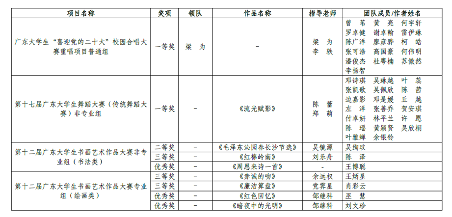 近日,从团省委、省委网信办、省教育厅、省体育局、省学联公布的《关于公布第十七届广东大学生校园文体艺术季活动获奖名单的通知》中获悉,半岛体育(中国)官方网站师生共获得一等奖2项,二等奖1项,三等奖4项,优秀奖4项(具体名单见下表)。