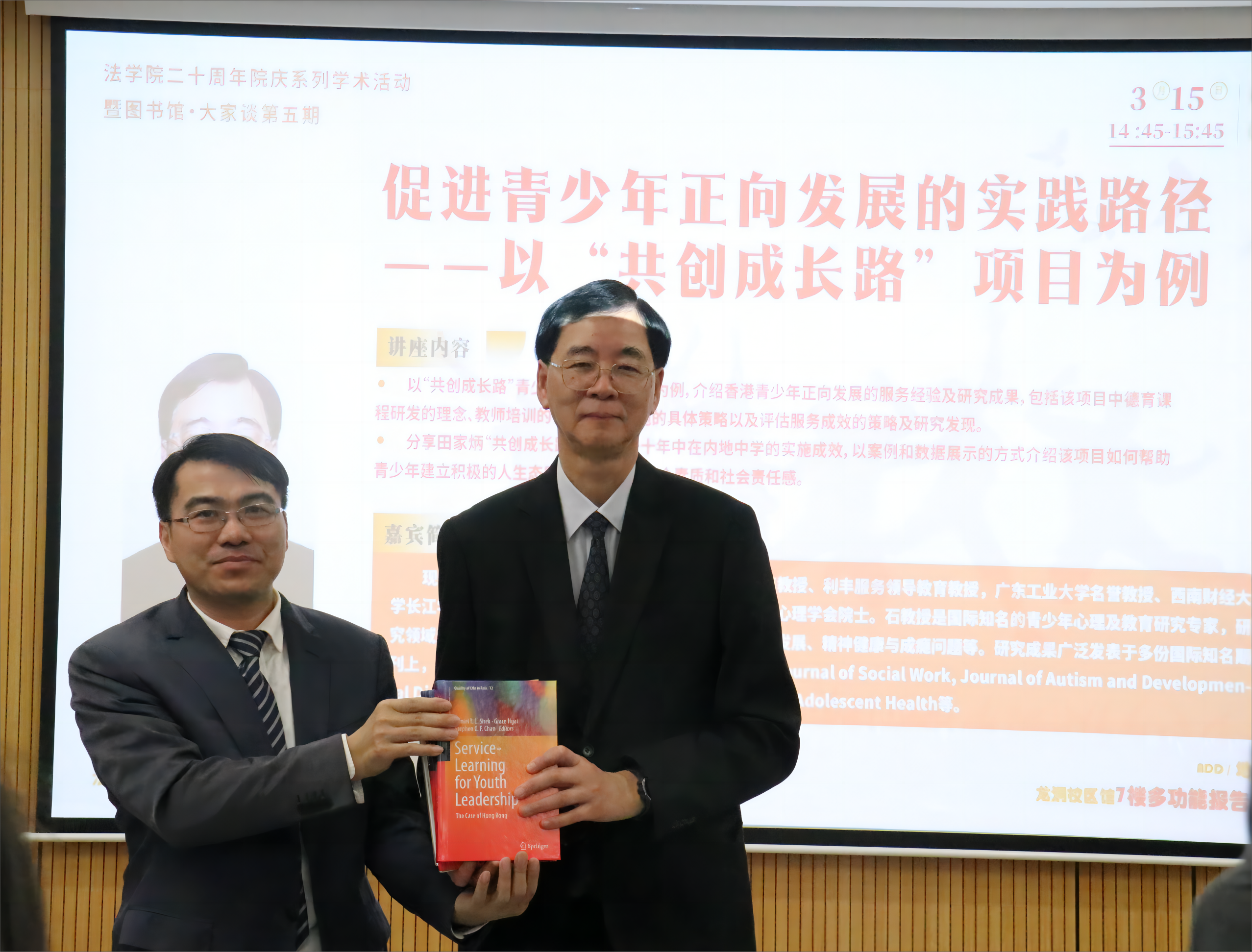 当天,二十周年院庆系列学术活动暨“图书馆·大家谈”第五期在图书馆龙洞校区馆七楼多媒体报告厅举办。活动邀请石丹理为师生作题为《促进青少年正向发展的实践路径——以“共创成长路”项目为例》的学术讲座。